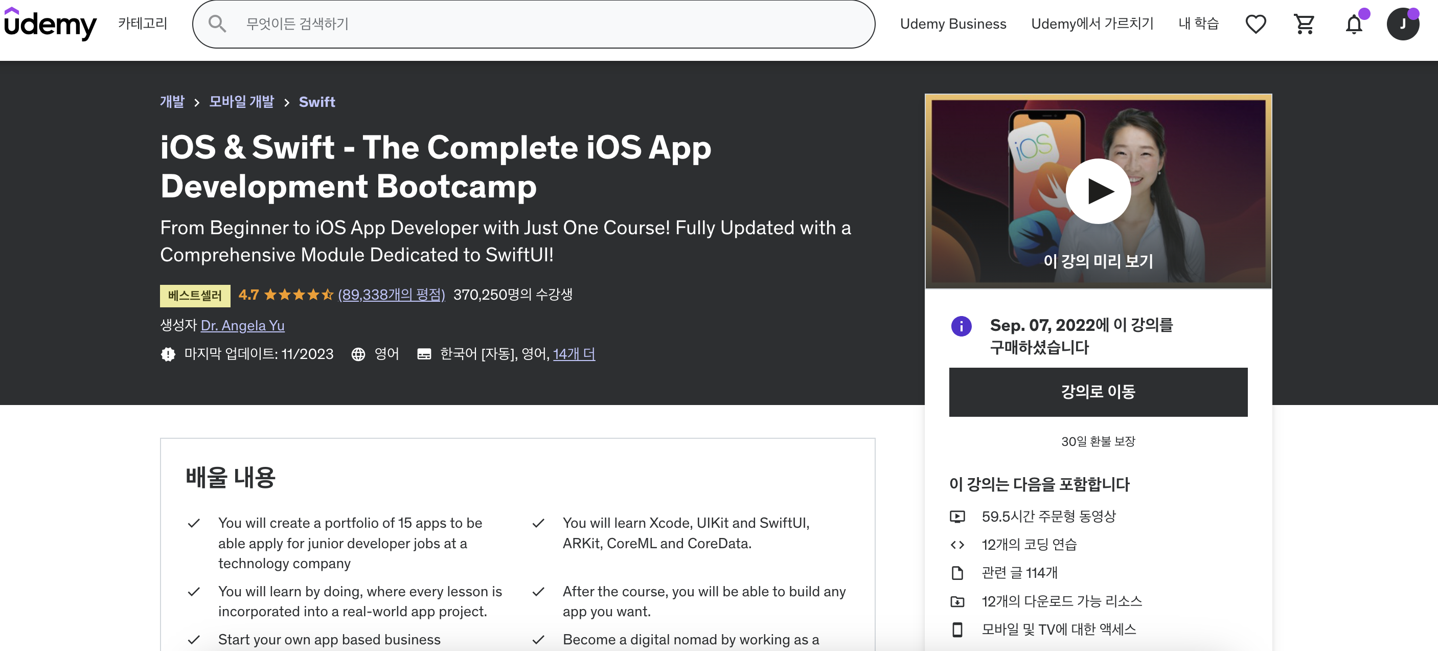 플랫폼은 Udemy, 강사는 Dr. Angela Yu